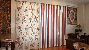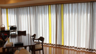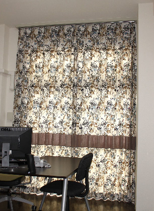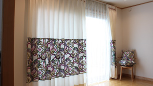 オーブでは、リフォームやリメイクも得意としているので、お引越ししても安心です。 大きいカーテンを小さくする丈詰めなどはもちろん、生地が足りない場合も別の生地を縫い足したり、組み合せたり、今ある物を生かしたデザインを提案します。 この写真は、元々2窓に掛けていたカーテンをお引越し後の高さの長い窓に合わせて、1つに縫い合わせた例。縦に同じ生地をそのまま縫い足しても、デザイン的には???なので、間にボーダーを入れて、デザイン的に成立させました。