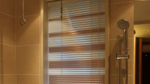 バスルームにはブラインドが機能的でお勧めですが、こうしてデザインする事も可能です。