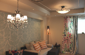 下のお写真は、カーテンはもちろん、壁紙、モールディング、照明、家具、クッションなど全てをコーディネートさせていただいた例です。