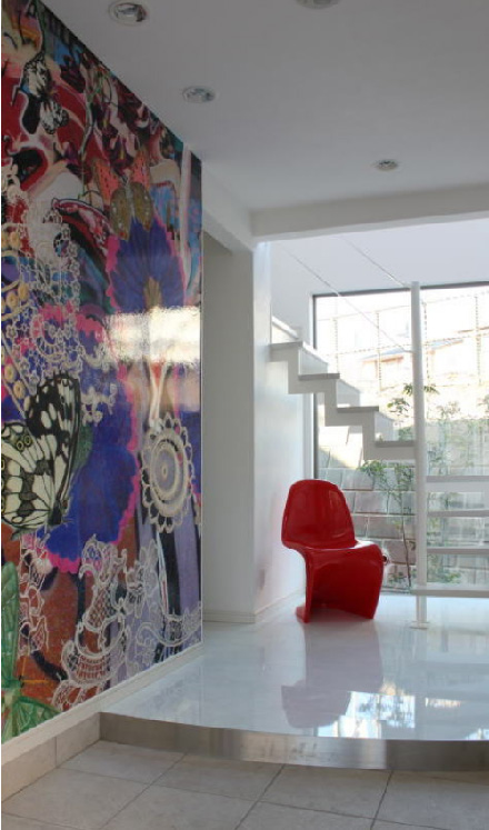 玄関はこのクロスが全てです。スイスの「ヤコブシュレイファー社」の物で、元々、マークジェイコブスやビビアンウエストウッドなどのファッションブランドに生地を供給している、超クリエイティブなテキスタイルブランド。