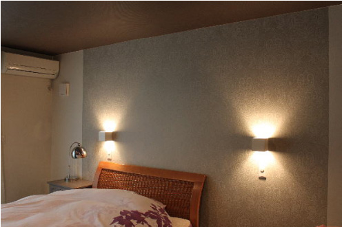 ウォールウォッシャーのダウンを仕込んでライトアップ。旗竿型の外から見えにくい敷地ながら、裏は駐車場なので、たぶんここが一番外から目立つ所なんです。