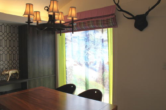 左に見えるのは、一面だけに貼ったデザイナーズギルドのクロス。右のシェードは、メインのストライプはALDECO(ポルトガル)の生地。無地とトリムを加えて、綿裏地を付けてプレーンシェードに。スペースが狭いので、ここはシェードじゃないと邪魔くさいんですよね~、本当はカーテンが好みなんだけど。