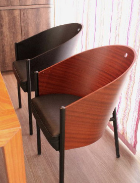 ダイニングチェアは、フィリップスタルクの「コステス」を色違いで2脚ずつ。スタルクの友人がパリにカフェをオープンさせる時にデザインしたもので、ウエイターが後ろからサーブする際に足を入れやすいように考えられた3本足。家庭にその必要は全くないけど、そのスタイルがいいじゃありませんか~。座面のクッションがソファの様に厚いのと、フィット感の良い背もたれのおかげで、長時間座っても疲れません。夫婦共にお酒の好きな我が家では、どうしても食事時間が長くなりがちなので、その辺りもセレクトのポイントです。