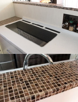 ダイニングと10cmの高低差があるので、少し高めのカウンターで仕切り、スパイスラックを2ヶ所に分けて作りました。カウンターとサイドラックの天板の部分はモザイクタイルで統一。やっぱりモザイクタイルに惹かれちゃうんですよね~。