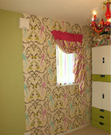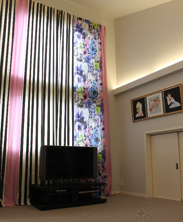 メインのカーテンはこんな感じ。デザイナーズギルドのプリントをメインに、ストライプとピンクパープルの無地を組み合せました。