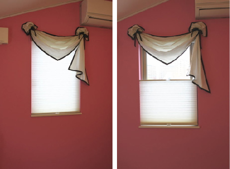 バランスは、メインとテール部分、それぞれに切り出した生地をバイアステープで縁どり、壁面に付けたヒートンにリボンで縛り付けただけの簡単仕上げ。とは言っても、切り出す形や生地のサイズなどは計算が難しく、何度もシュミレーションを繰り返しました。
