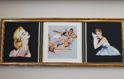 ミッドセンチュリーのシネマをテーマにしたイギリスのアンドリューマーチン社製の生地をヴィンテージ・ゴールドのフレームで額装しました。