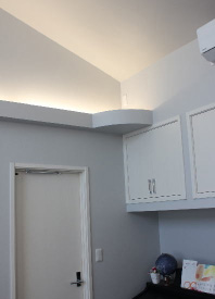 壁面に付けた間接照明と一体型の「サーキュレーター置き場」。左右に配置して2台回せる様にしてます。