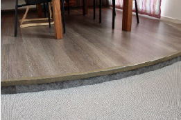 リビングはカーペット、ダイニングはフローリング、で、その間を10cmステップさせて、ここもカーブに仕上げました。