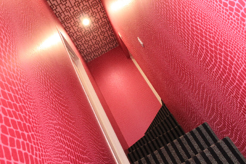 リビングから見える、その上へと続く階段は、こってりと怪しい空間に。「どこに続くんだろ~?」と思う様な怪しさが欲しかったので、ショッキングピンクのクロコダイル柄とモノトーンで仕上げました。