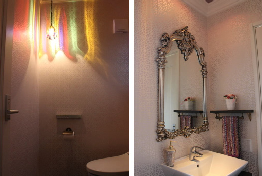 壁紙は、ハーレクインのプリントと無地のピンクを組み合せています。