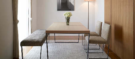 ダイニングチェアは、必ず同じ場所に座るという事で、ソファよりも耐摩耗係数の高い生地が求められます。また、撥水や汚れ防止の生地をセレクトする事もお勧めです。写真のダイニングチェアやベンチは、新品で購入する際にも支給生地で製作できるので、初めからオンリーワンが作れます。 そういったチェアやソファもたくさんあるので、先ずはご相談ください。