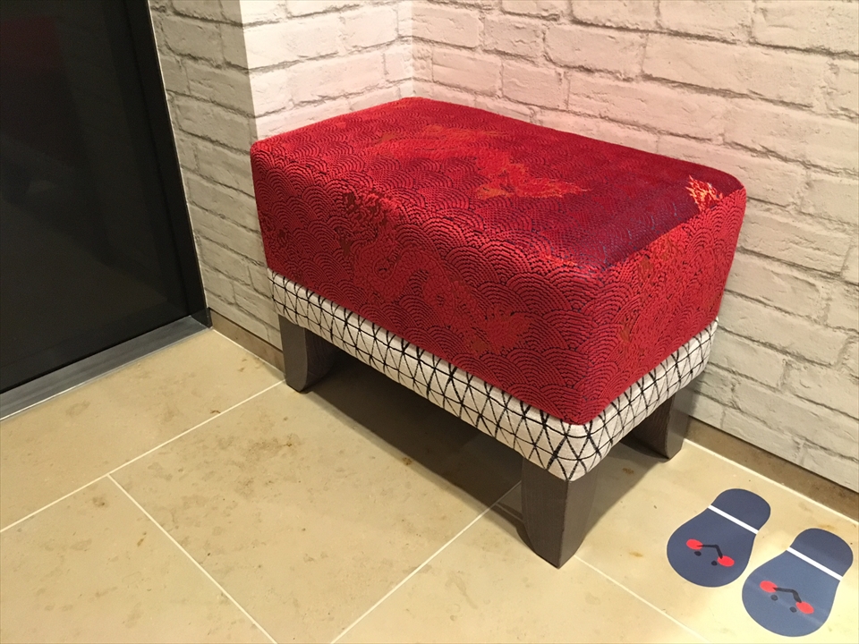 マンションの玄関ホールに合わせて、一から製作したスツールなので、 サイズもデザインも思いのまま。 赤の張り地は江…