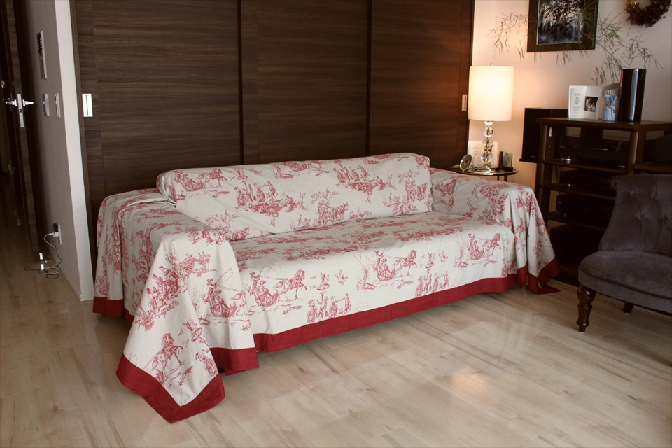 小さなお子様対策で、ソファにカバーを。 一枚の布を被せるだけですが、縁取りを付けるだけで上質感は段違いです。 この手…