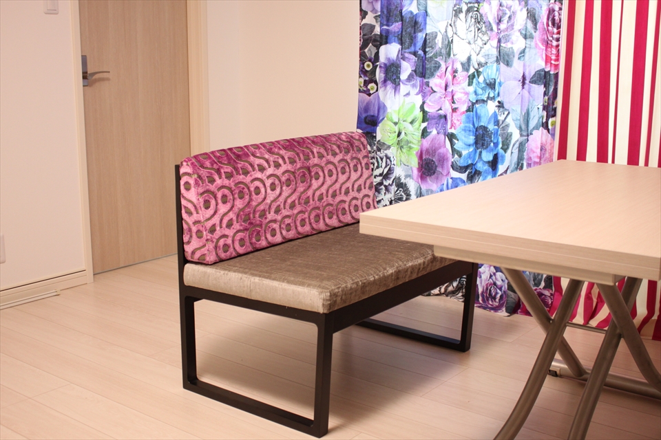コンパクトながらもソファとダイニングチェアを兼用でき、なおかつ カーテンに合うデザインで、というのは既製ではなかなか…