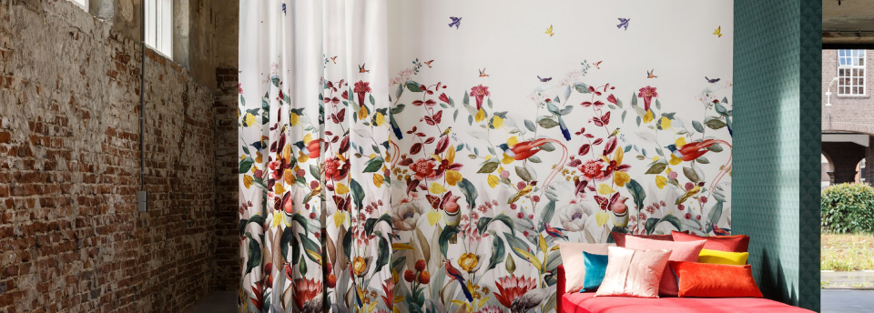 子供部屋の腰窓に、トロピカルな花柄を上質な刺繍で描いた生地で、プレー…