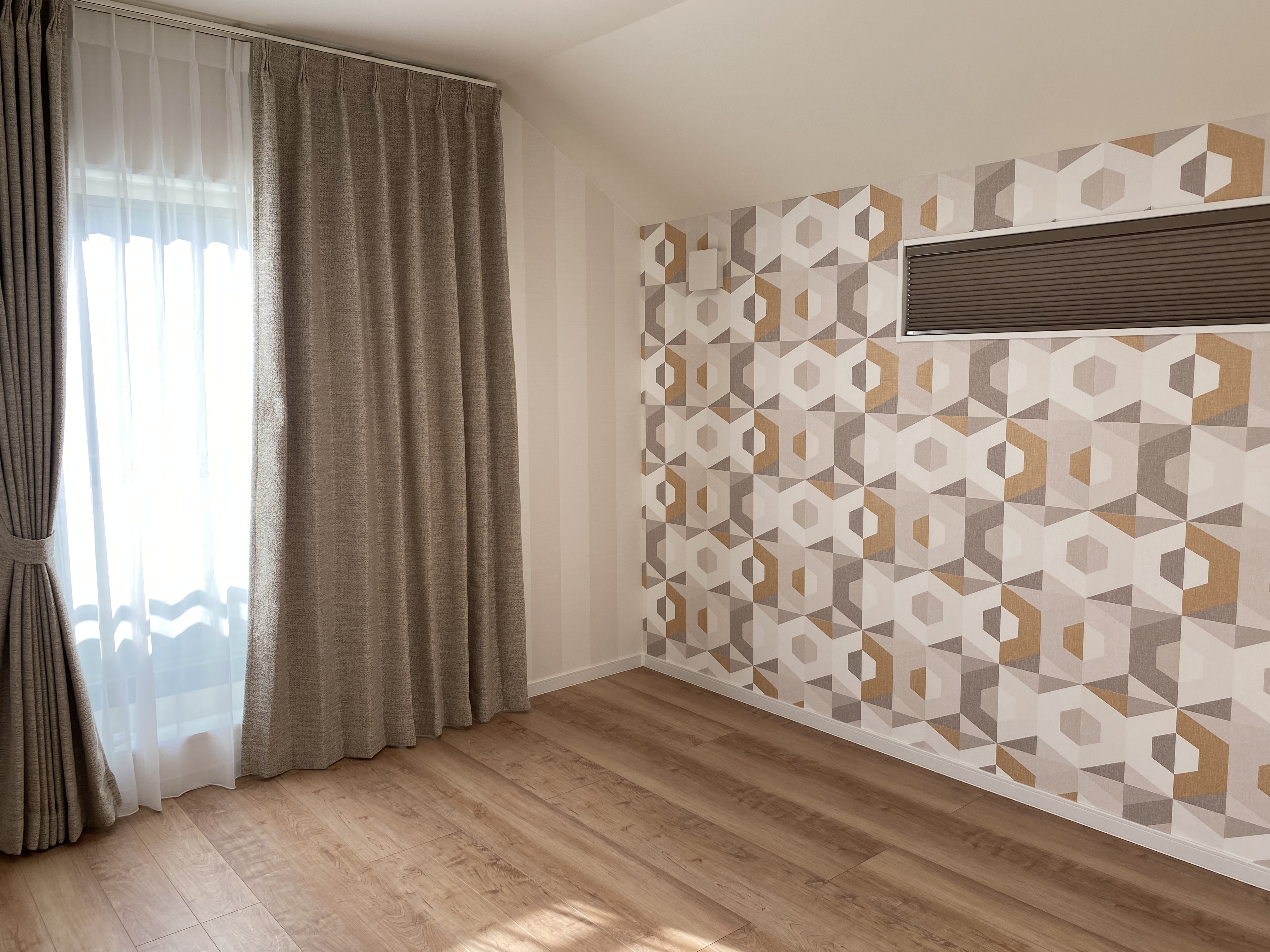 カーテン、壁紙、照明、ラグ、クッションをコーディネートさせて頂きまし…