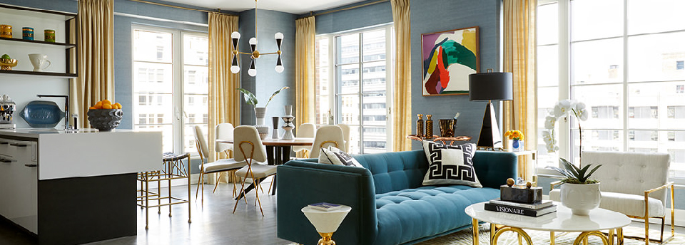 ラグジュアリー系トロピカル柄のカーテン、モダンなソファ、シノワズリーなファブリ…