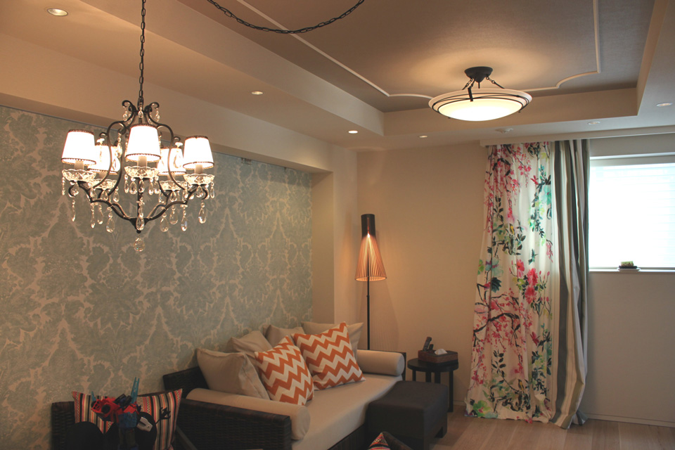 カーテン、壁紙、照明、ラグ、クッションをコーディネートさせて頂きまし…