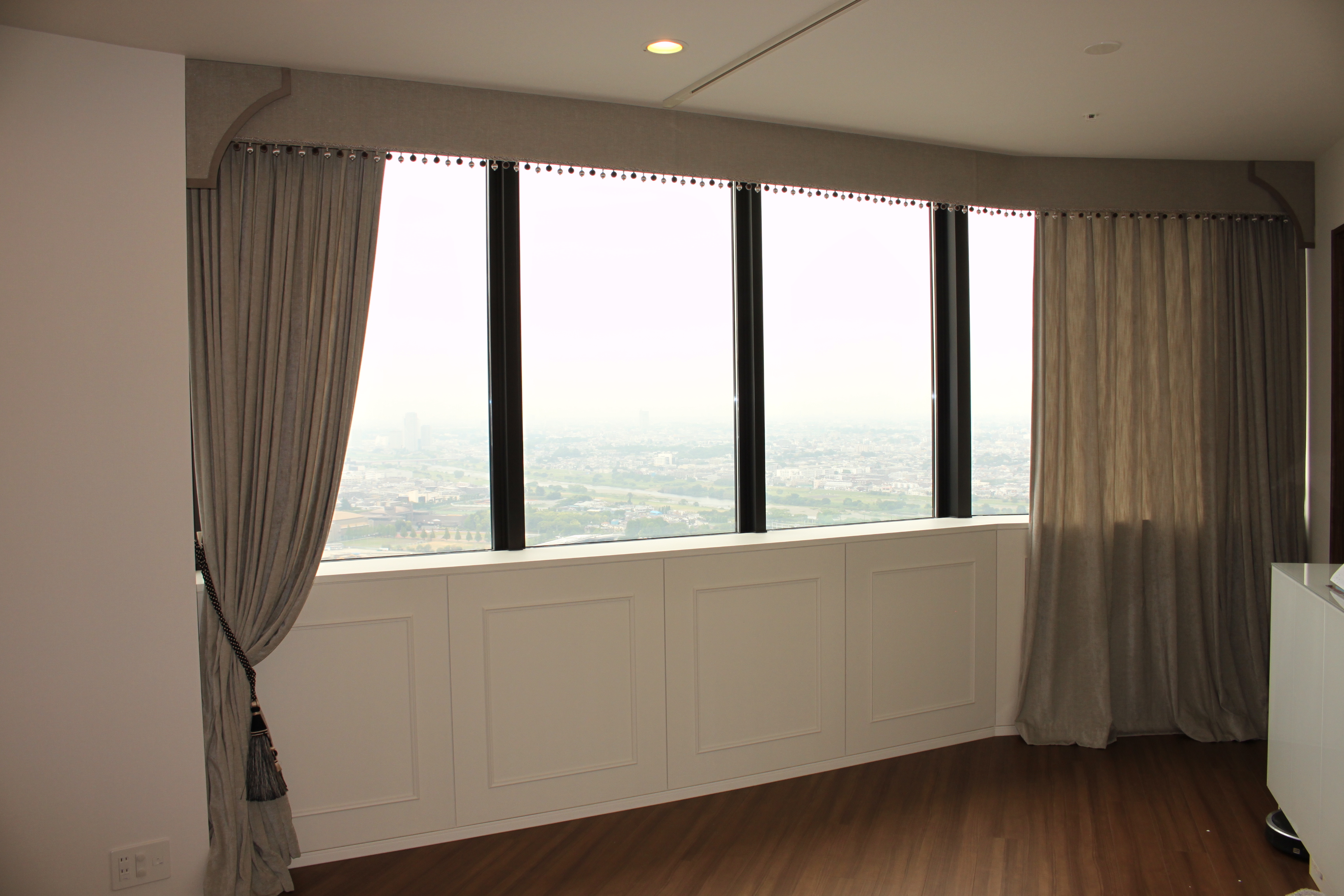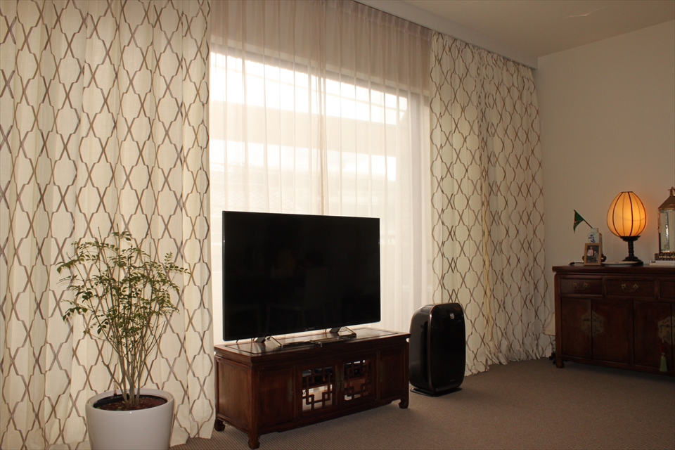 リビングの大きな窓に、ブルー~グレー系の3色で切り返してドレープカー…