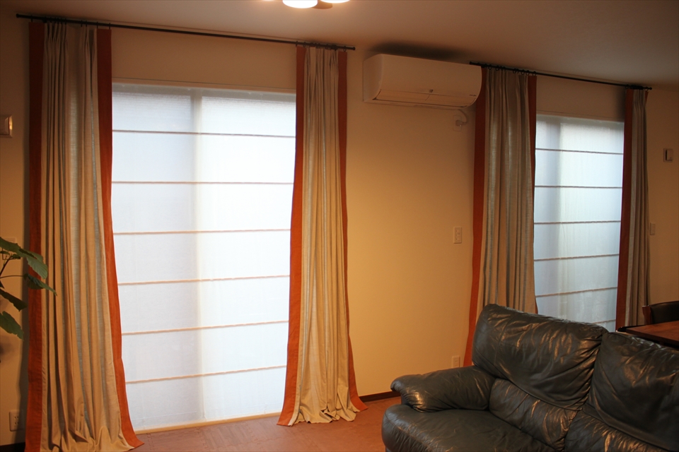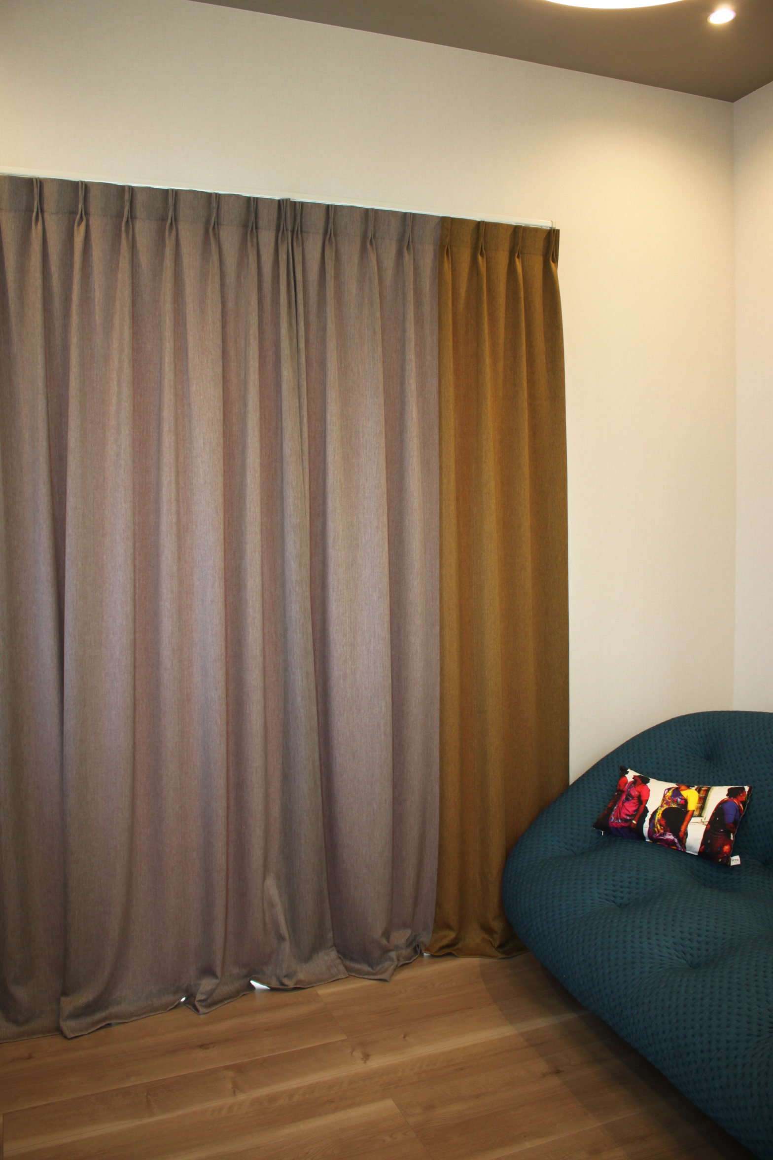 2色の無地を組み合わせた、いわゆる「切り返し」で作ったドレープカーテ…