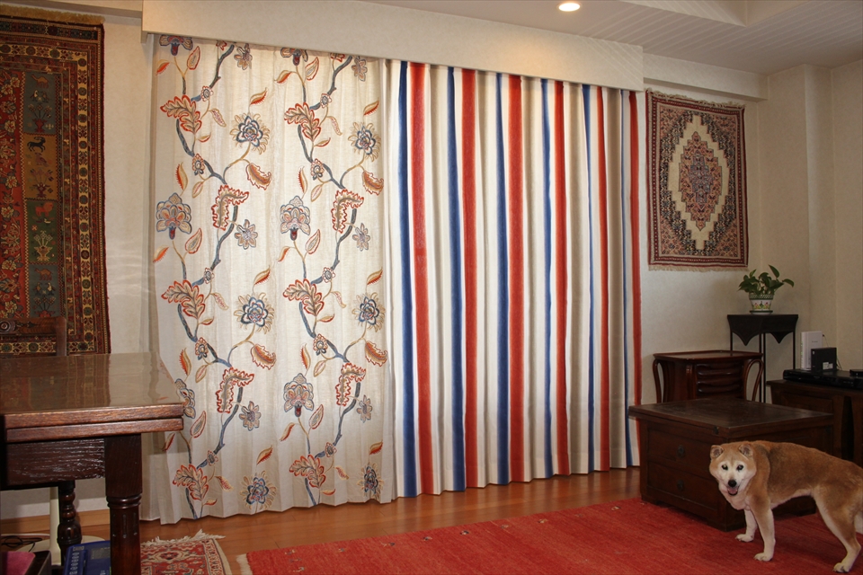 2019.12.11 刺繍とアップリケが組み合わされたクラフト感漂う生地をメインに、同系色のボカシたストライプを合わせたリビング。
